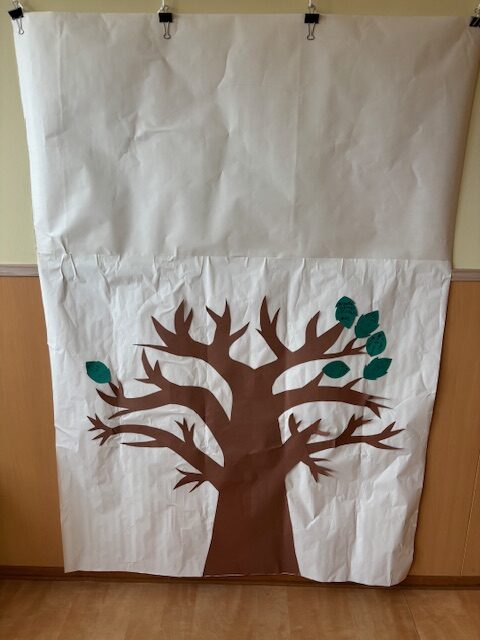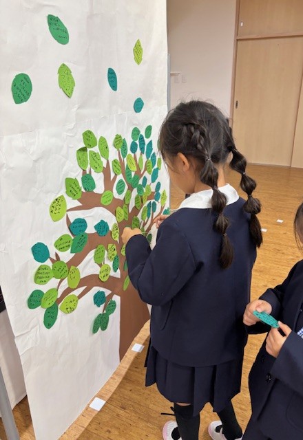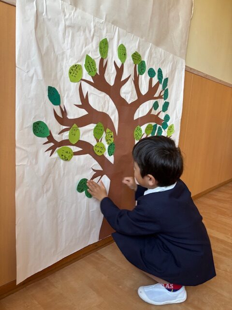 普段の生活の中で、小さなことでもその子なりの頑張りを見つけた時に、葉っぱに記して張り付けていきました。自分で振り返りを行ったり、見つけ合いっこも行いました。枝だけの成長の木に葉っぱが増えていく様子も喜びとなりました。