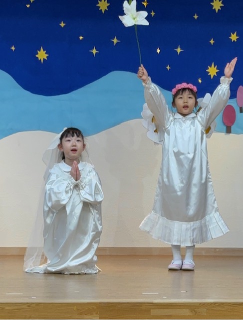 年長では、わくわく、嬉しい、待ち遠しい気持ちで、降誕劇の始まりのお歌を心弾むように歌おうと試みました。