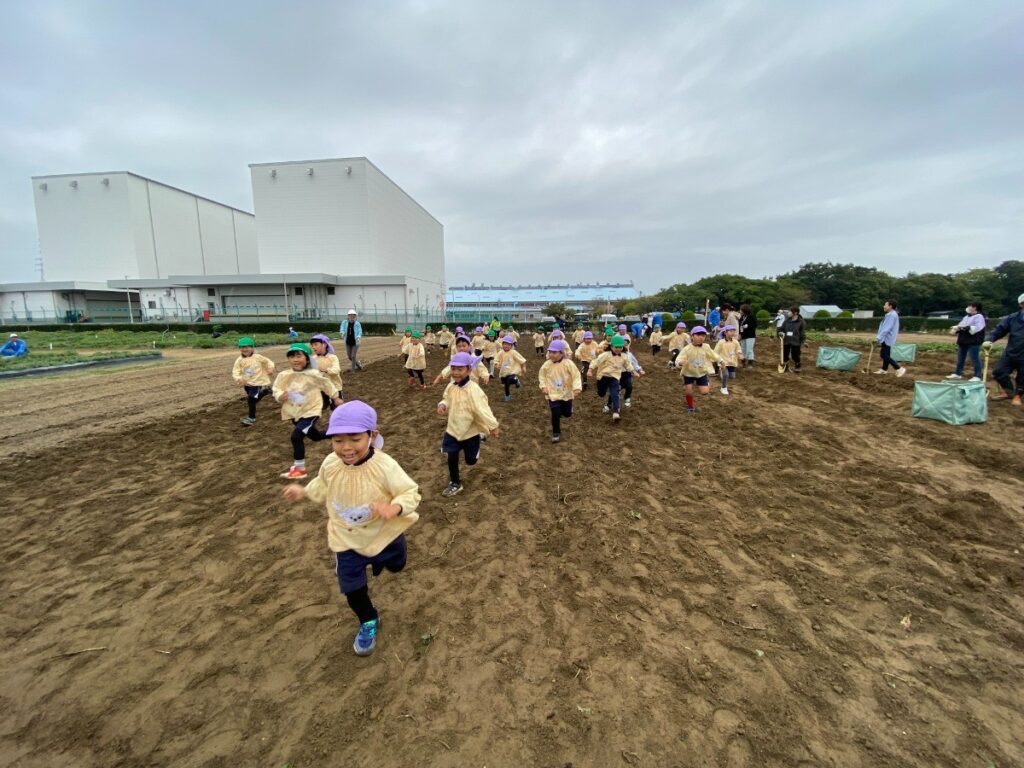 年長と年中は芋畑まで歩いて、年少はバスで出発!!