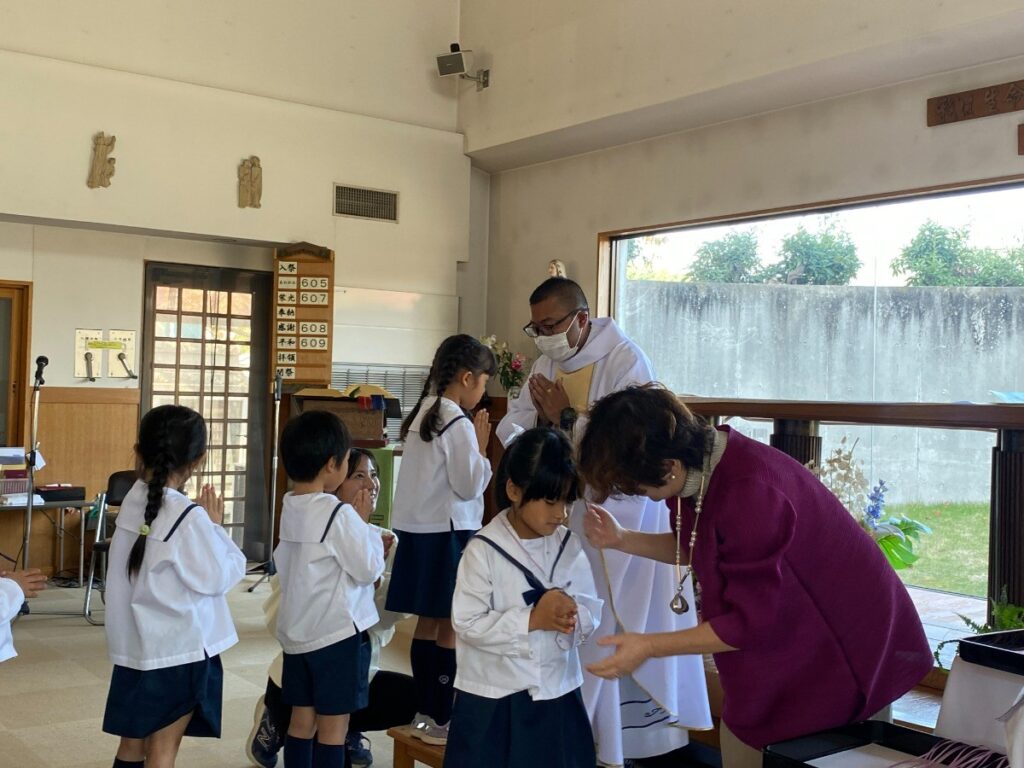 神父様から祝福をいただき、園長先生からはおメダイを、なお先生からは千歳飴をいただきました。