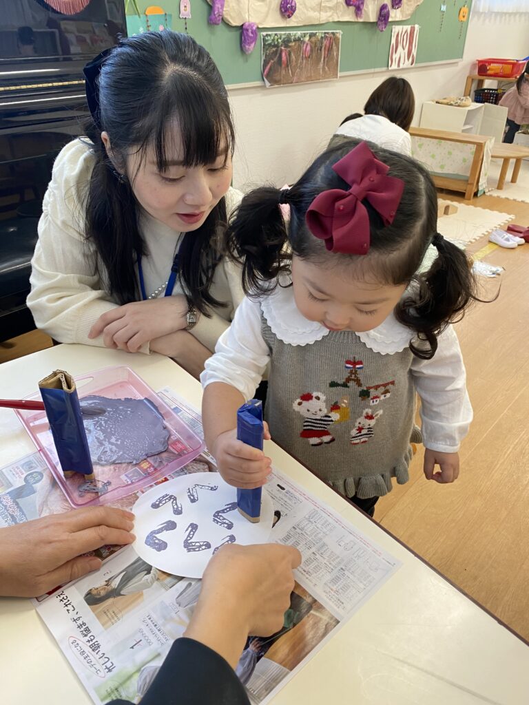 歌や手遊びや指先を使ういろいろな「おしごと」。絵本、季節の製作等を通じて、初めての集団生活に向けて、ゆったりとした雰囲気の中で幼稚園に親しんでいただけるクラスです。